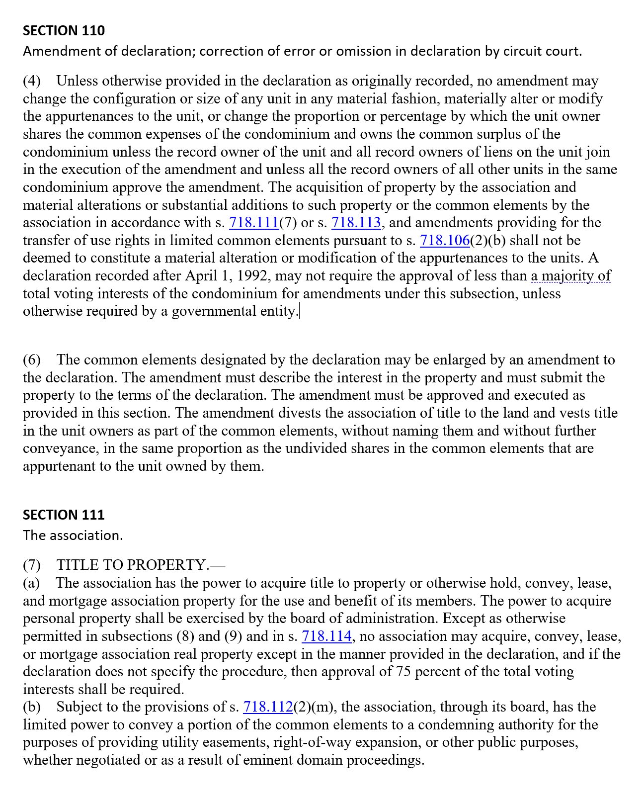 718.111(7) was correctly presented. This statute says that our association can acquire property for the use and benefit of its members in the method specified by our Declaration which requires a majority of prior approvals. This is echoed in our Declaration in article 8.4(B).